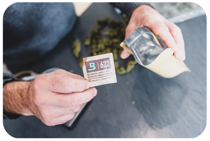 Notre travail ne s'arrête pas à la pesée. La touche finale, notre secret pour une conservation parfaite, est l'ajout d'un sachet Boveda 58% dans chaque pochon : il s'agit d'un régulateur d'humidité.